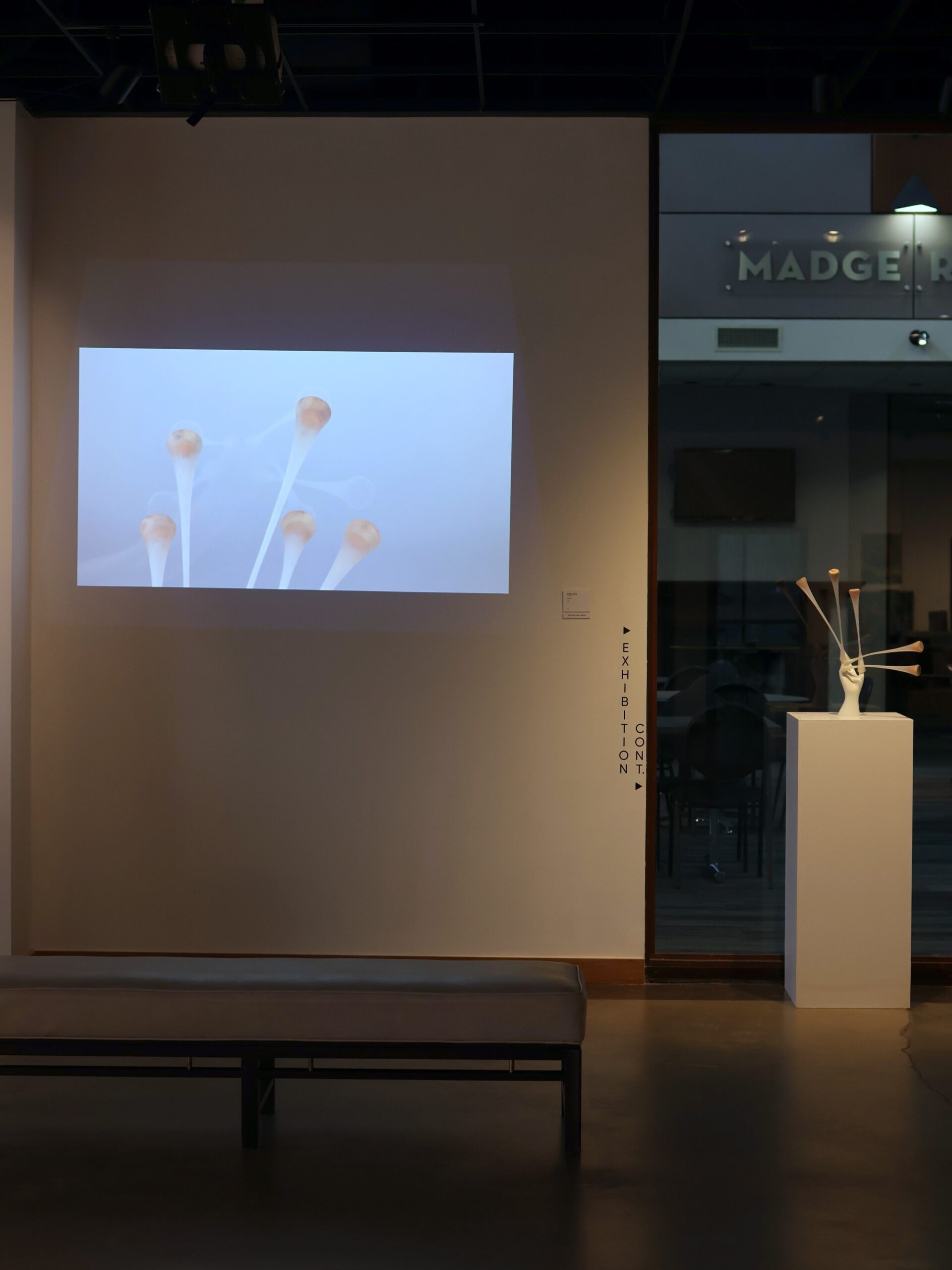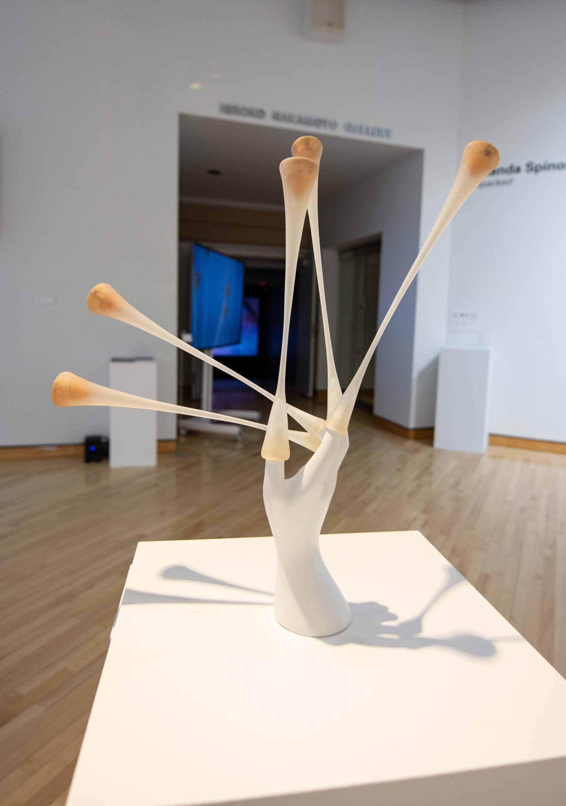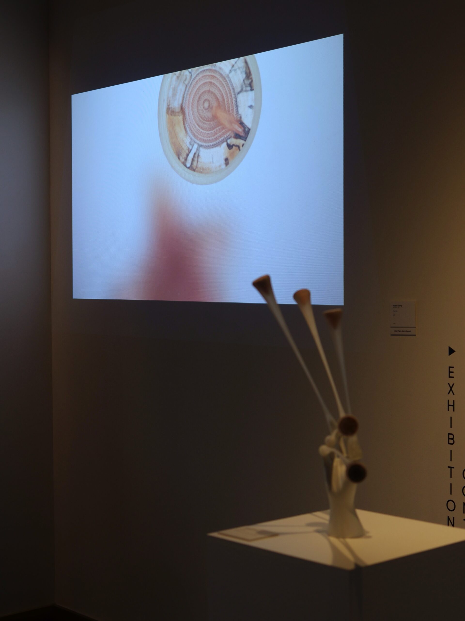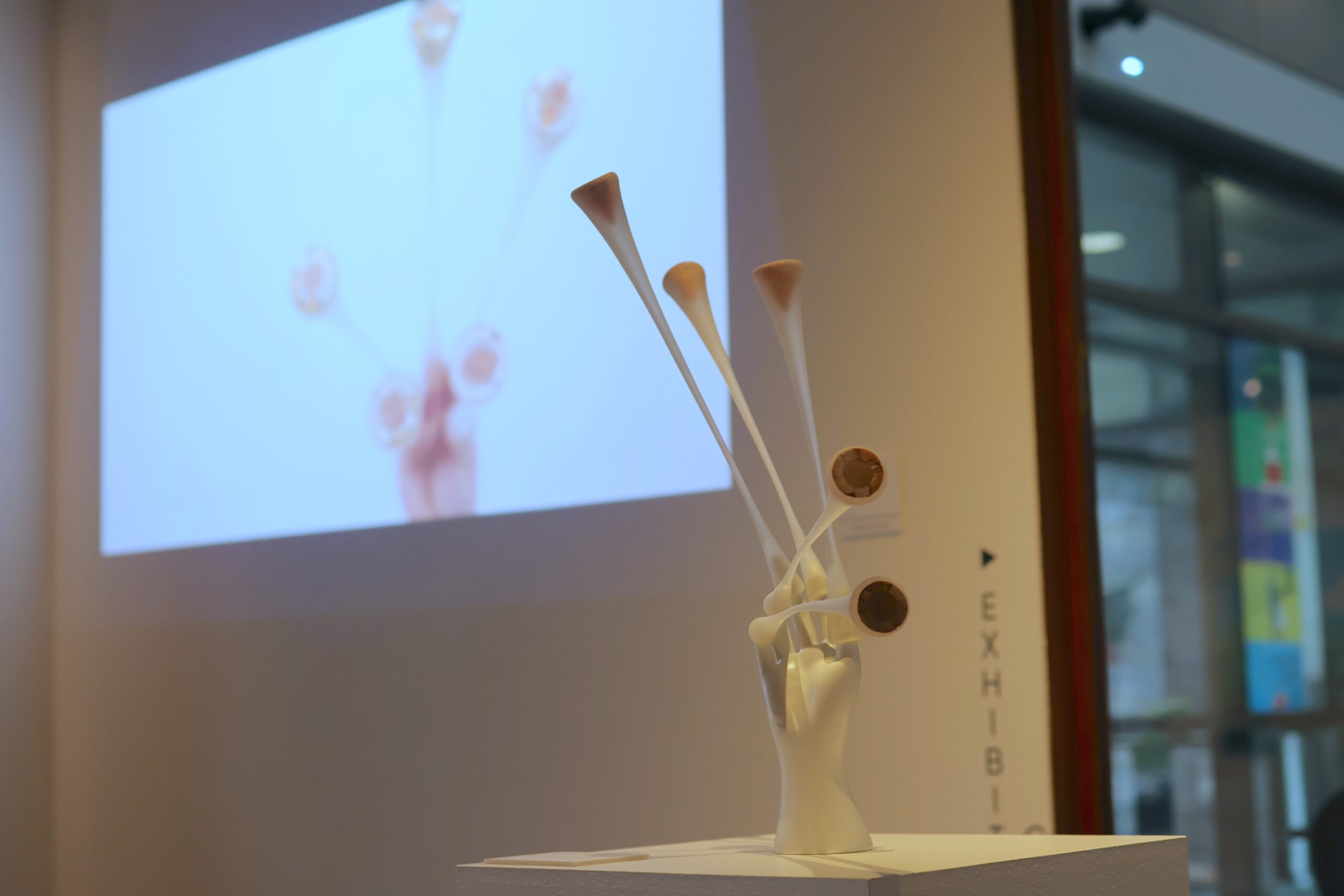 In the video, the hand wearing the finger extensions constantly reach toward the camera, confronting the viewers, futilely attempting to sense through the glass. The video was shot with shallow depth of field. In close framing, “fingertips”—the cross-sections— come in and out of focus either tapping, knocking, or caressing the screen. The form, materials, and process of this piece all serve to express the conflict between nature and technology. Technological advancement extends our reach beyond what our body allows us, while at the cost of truncating our sensory experience.