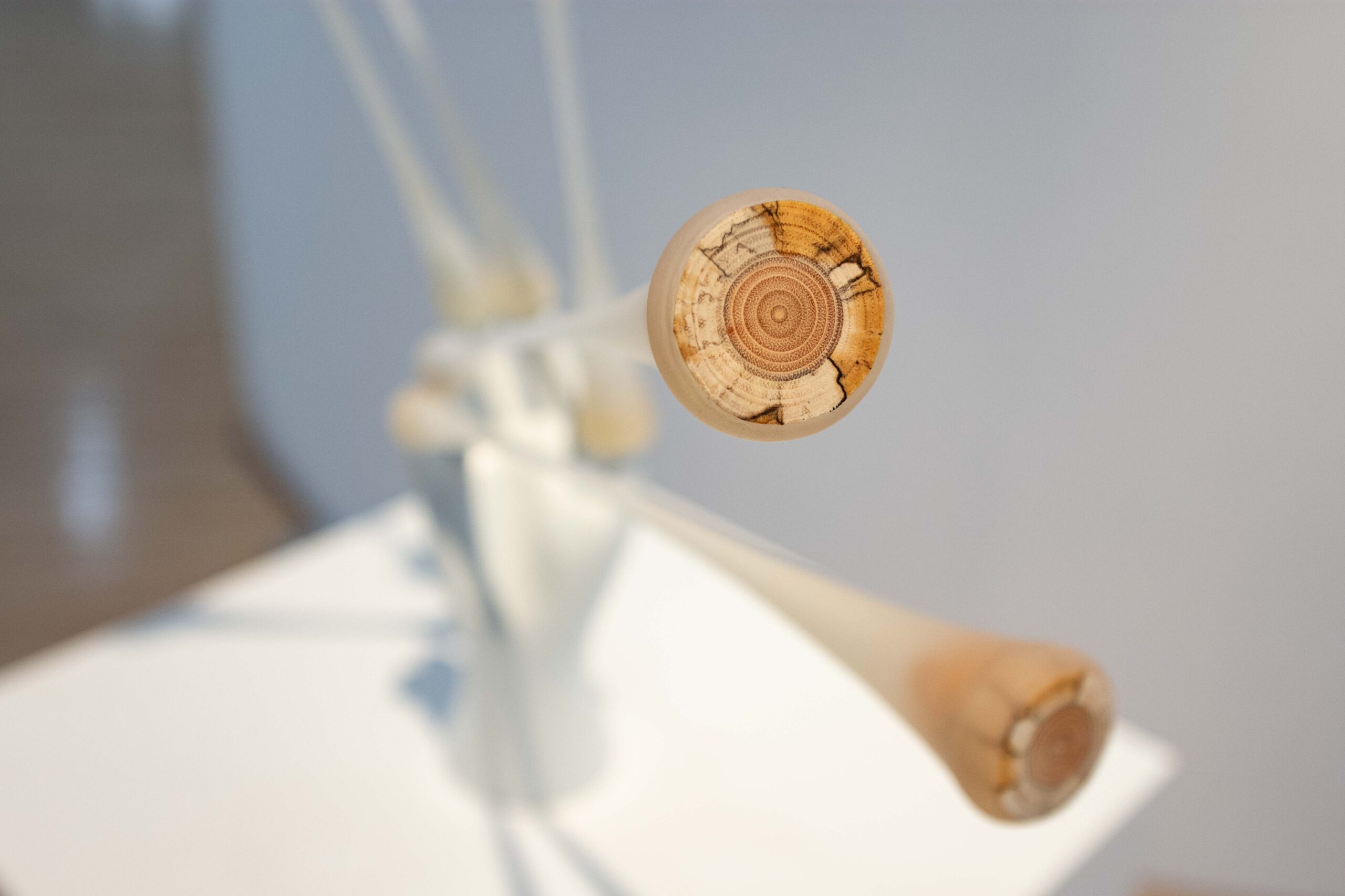 This performance promotes sensory experiences of the body. Inspired by the performative work “Finger Gloves” by Rebecca Horn, the set of wearable objects consists of five elongated prosthetic finger extensions for a single hand, 3D modeled and printed using clear FormLabs resin. The end of each finger extension was inserted with a peg of tree branch carved into a cone shape, exposing only the cross-section of the tree, visually as an abrupt end of the “fingertip.”